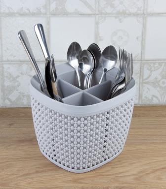 Габариты: 170x160x140 мм. Сушилка для столовых приборов — необходимая вещь на каждой кухне! Четыре секции позволят сушить или хранить столовые приборы по отдельности. Одна из секций меньше по глубине, что даёт возможность складывать в неё небольшие предметы, например, чайные ложки и они не "утонут" в отсеке; Она устойчива даже если в ней хранить крупные кухонные принадлежности – половники, шумовки, лопатки и т.д.; Уникальное жемчужное плетение гармонично впишется в любой интерьер; Покрытие по технологии «Soft-touch», создаёт особый приятный эффект теплоты и мягкости; Дополняют линейку изделий, выполненных в одном дизайне; Можно мыть в посудомоечной машине