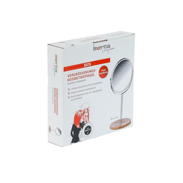 Настольное двухстороннее зеркало в оправе из хромированной стали имеет влагостойкое покрытие и регулятор наклона. Оно будет удобным в ванной комнате или на туалетном столике. У зеркала две поверхности, одна из которых дает обычное отражение, другая - с трехкратным увеличением. У зеркала отсутствует геометрическое искажение. Высота зеркала: 34 см. Диаметр зеркала: 17 см. Диаметр поставки: 15 см. Длина ножки: 15 см.