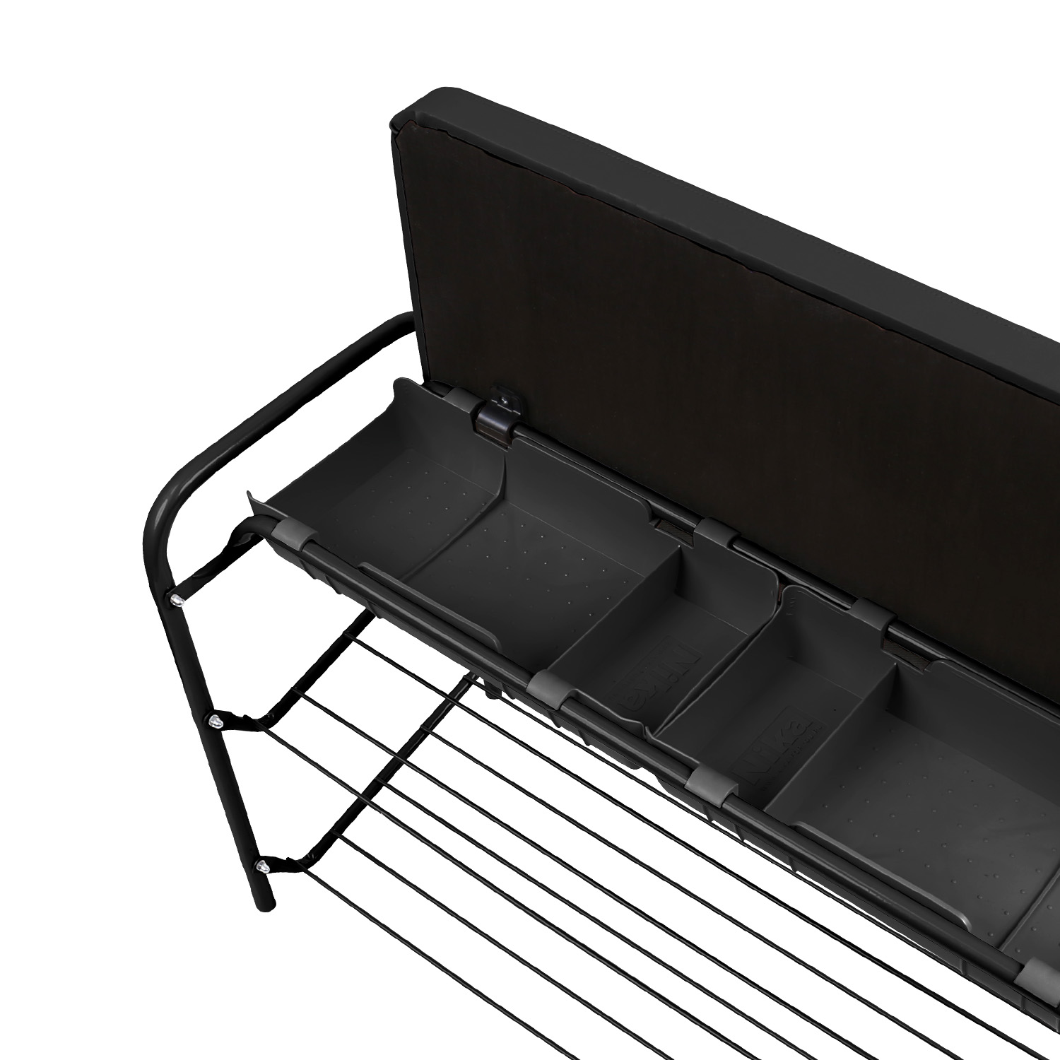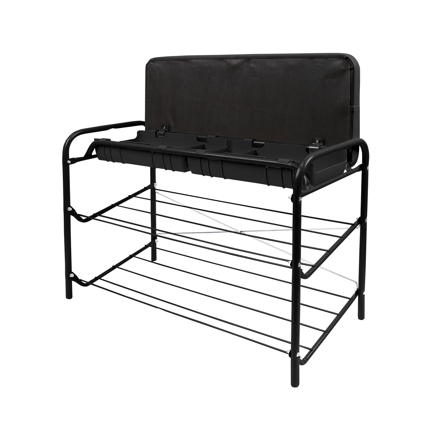 Напольная подставка для обуви. Преимущества: 2-х ярусная этажерка с мягким удлиненным сидением. Встроенный ящик в сиденье для хранения принадлежностей по уходу за обувью усиленный металлический каркас. Материал сиденья прочный, устойчивый к истиранию и легкий в чистке покрытие каркаса этажерки устойчиво к механическим воздействиям. Пластиковые колпачки на ножках защищают поверхность пола от царапин допустимая нагрузка не более 100кг конструкция этажерки разборная. Характеристики: габаритные размеры в разложенном виде (ДхШхВ): 790х330х510мм габаритные размеры в упаковке (ДхШхВ): 830х355х145мм. Размер сиденья (ДхШ): 740х305мм. Высота между полками: 200|175мм вес: 6,46кг . Материал: каркас - стальная труба с порошковым антикоррозийным покрытием сиденье - винилискожа. Колпачки на ножках - пластик.