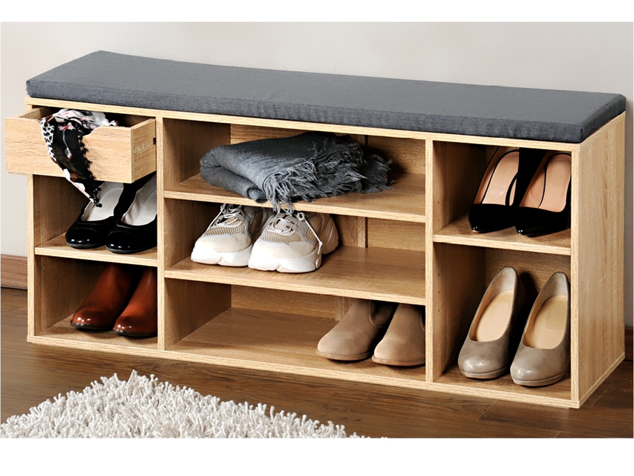 Практичная полка для обуви Kesper с сиденьем предлагает место для хранения вашей обуви, а вы можете удобно сидеть на сиденье, надевая и снимая обувь. Он отличается стильным декором из дуба. Имеет выдвижной ящик и два отделения. В нем можно хранить до 10 пар. Грузоподъемность сиденья до 150 кг, размеры обувной коробки 101 х 48 х 29 см.
