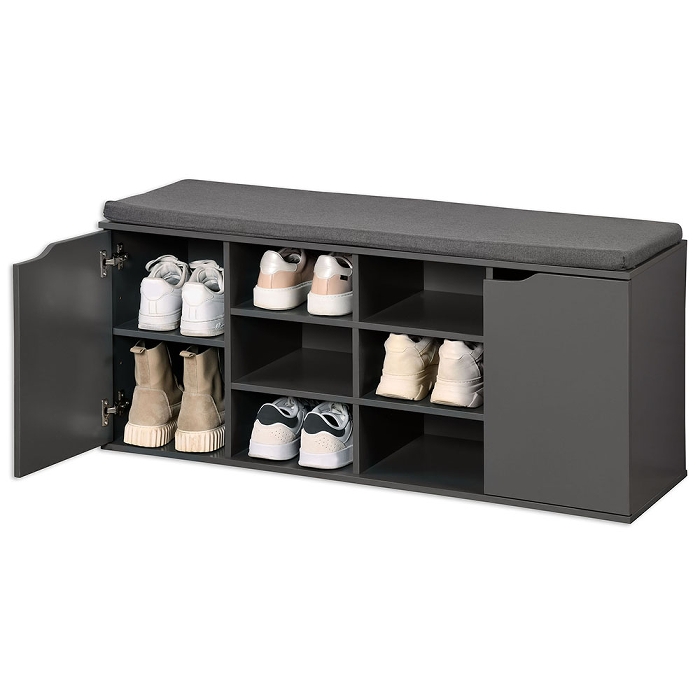 Материал: ДСП (FSC®), Полиэстер . Цвет: серый . Длина 30,5 (см) Ширина 103 (см). Высота 48 (см). Кроссовки, кроссовки, высокие каблуки. Сейчас в наших шкафах полно разнообразных пар обуви на все случаи жизни. Обувной шкаф KESPER® с подушкой для сидения поможет вам оптимально использовать свое пространство, с 2 большими и 6 маленькими отделениями он предлагает огромное количество места для хранения ваших любимых пар, а благодаря подушке для сидения он также обеспечивает практичное сидение, так что можешь спокойно обуваться. Используйте 2 больших, разделяемых друг на друга отделения за дверцами, например, для хранения обуви. В шкафу можно хранить не только обувь, но и перчатки, шарфы, шапки или даже любимые игры. Много места для хранения, многофункциональность, простой дизайн... С тумбой для обуви KESPER® с подушкой для сидения вы всегда будете на высоте!