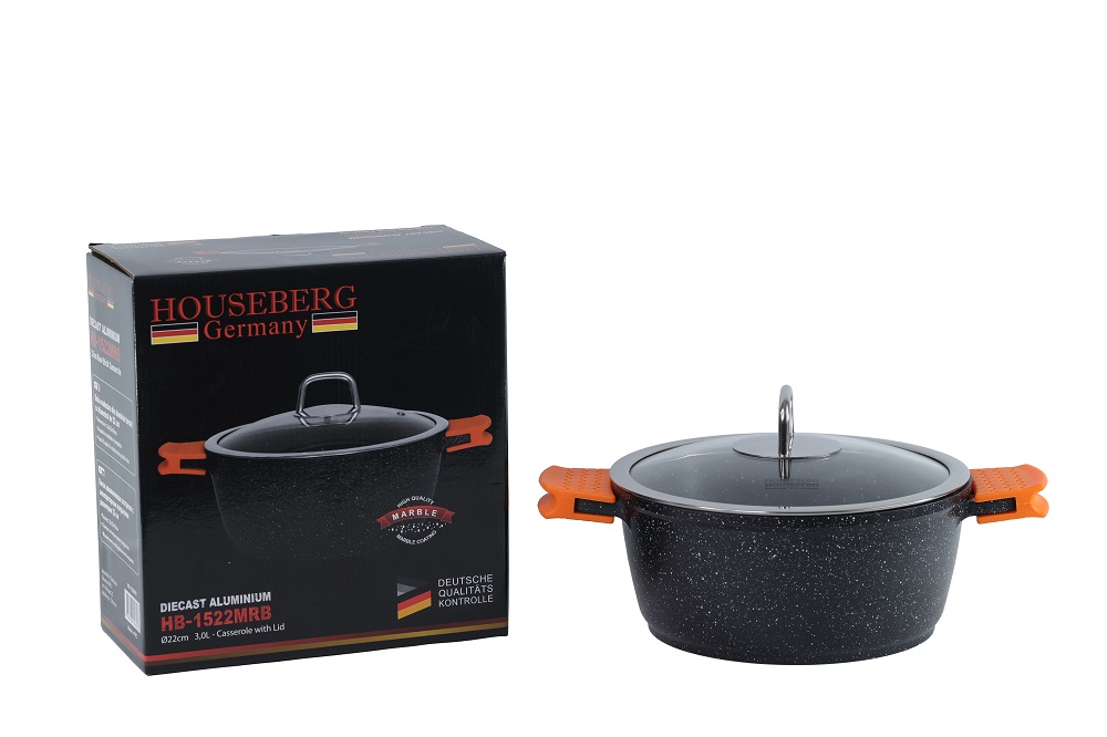 Кастрюля с мраморным антипригарным покрытием Housberg станет великолепной помощницей на вашей кухне.Диаметр кастрюли: 22 см. Обвод кастрюли: 3 литра. Материал кастрюли: литой алюминий. Материал крышки: жаропрочное стекло. Кастрюля Housberg имеет привлекательный вид, чрезвычайно устойчива к царапинам – непременно станет важнейшим дополнением к Вашей современной кухне. Имеет антипригарное покрытие для приготовления вкусной и здоровой пищи. В комплект входит защитные силиконовые прихватки для ручек, хорошо себя зарекомендовавшая в эксплуатации. Благодаря жаропрочной крышке подходит для использования в духовке, а также подходит для всех типов бытовых плит, включая индукционную. Можно мыть в посудомоечной машине. Housberg – изнаночный приводник кухонной посуды из Австрии. Изделия под маркой Housberg можно использовать заслуженным спросом, подошву меногийные украинские хозяйки смогли оценить качества и дизайн этовой посуды по привлекательной цене.
