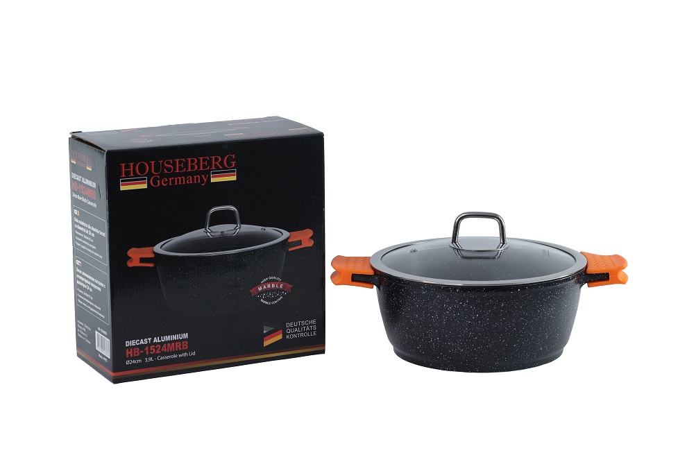 Кастрюля 3,9 л . Характеристика: Объем: 3,9 л. Диаметр: 24 см Материал кастрюли: литой алюминий. Материал крышки: стекло. 2 силиконовые насадки на ручки. Антипригарное мраморное покрытие. Подходит для всех типов бытовых плит, включая индукционную. Можно мыть в посудомоечной машине. Упаковка: подарочная.