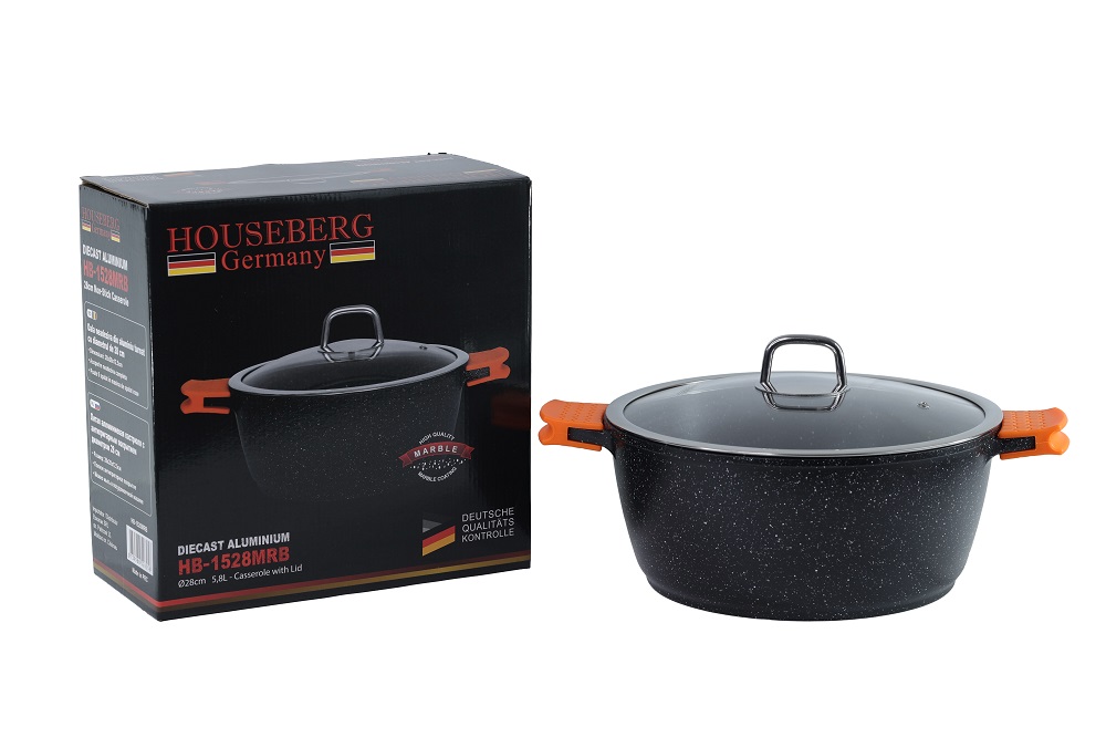 Объем: 5.8л. Диаметр: 28 см. Материал: алюминий. Крышка: Стеклянная. 2 силиконовые насадки на ручки. Антипригарное мрамор-гранит покрытие Подходит для всех типов бытовых плит, включая индукционную. Можно мыть в посудомоечной машине. Упаковка: подарочная.