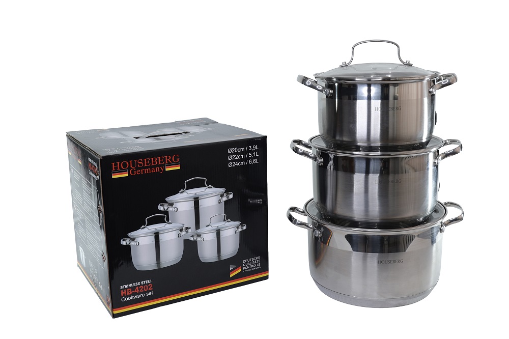 Посуда изготовлена из высококачественной нержавеющей стали. Этот материал имеет высокие показатели экологической чистоты и сохраняет прекрасный внешний вид даже после многолетнего использования. Сталь - исключительно жаропрочный, ударопрочный, износостойкий, не подверженный коррозии материал, имеет высокую плотность и обладает бактерицидными свойствами. Многослойное капсульное дно посуды обеспечивает равномерный нагрев и долгое сохранение тепла, позволяет готовить полезную пищу быстро и без пригорания. Кастрюли комплектуются термостойкими стеклянными крышками со специальными отверстиями для выхода пара. Стальные ручки имеют надежное крепление и не нагреваются во время готовки. Возможно использование в духовке. Состав набора посуды - нержавеющая сталь 18/10. Пятислойное капсульное дно, нержавеющая сталь. Крепление ручек - клепочное. Термостойкая стеклянная крышка. Подходит для электрической, стеклокерамической, газовой, галогеновой, индукционной плиты. Набор посуды можно мыть в посудомоечной машине. Кастрюли - 20 х 12,5 см - 3,9 л. Кастрюли - 22 х 13,5 см - 5,1 л. Кастрюли - 24 x 14,5 см - 6,6 л.