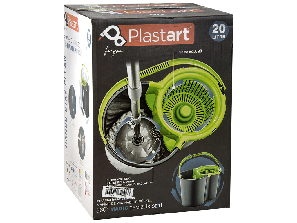 Набор для влажной уборки состоит из швабры-полотера и ведра с центрифугой, которое предназначено для максимального отжима воды. Материал: 100% микрофибра (насадка швабры), пластмасса (ведро, ручка), сталь (основа швабры). Насадка швабры (моп) отлично впитывает влагу, диаметр насадки 17см, длина ворса 10см. Ручка полотера вращается на 360°, угол поворота ручки 180°, благодаря этому Вы с легкостью сможете вымыть пол в труднодоступных местах: под кроватью или шкафом. Длина ручки швабры в разложенном виде: 92см, 115см. Ведро с центрифугой объемом 20 литров: 43х31х30,5см. Центрифуга на ведре работает следующим образом: Вам необходимо опустить защелку вниз, которая расположена в нижней части ручки полотера; поставить полотер в центрифугу, затем движением ручки вверх-вниз запускаете механизм отжима воды, после этого вернуть защелку в исходное положение. Набор доставляется в оригинальной коробке 32х31х44,5см.