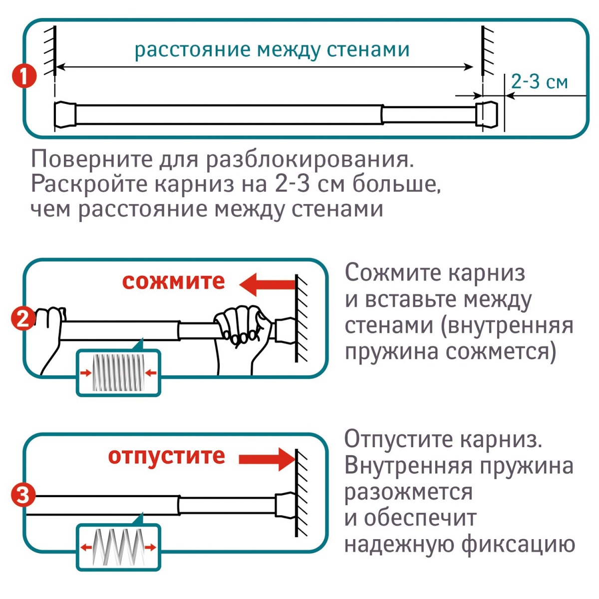 Прямой телескопический карниз изготовлен из нержавеющей стали. Устанавливается в распор между двумя стенами в ванных комнатах и любых других помещениях. Он прочно крепится к стене благодаря инновационному механизму установки, при необходимости легко снимается и может использоваться многократно. Длину карниза можно регулировать - от 140 до 260 см. Карниз не подвержен коррозии и устойчив к царапинам. Особенности карниз простой и надежный механизм установки. Подходит для ванн с размерами 140-260 см. При необходимости быстро и легко демонтируется. Изготовлен из материалов, обеспечивающих долговременное использование в помещениях с высокой влажностью.