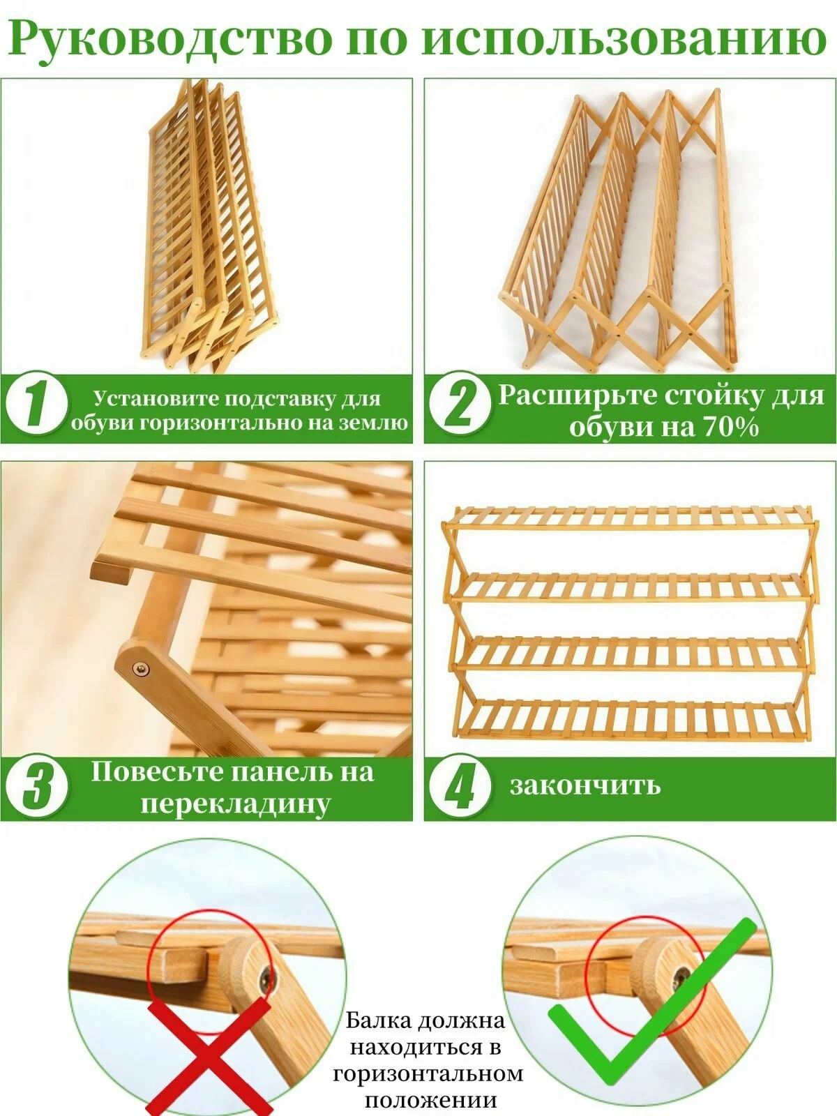 По сравнению с другими материалами или молодым бамбуком, этот зрелый бамбук имеет более высокую плотность волокон и более долговечен. Если вам нравится этот стиль, то его минимализм и естественный дизайн делают его хорошим выбором. Пожалуйста, обратите внимание на следующие моменты при использовании: 1. При раскладывании не открывайте панель полностью, чтобы не растягивать ее слишком сильно, что может привести к тому, что панель плохо закрепится на перекладине; подождите, пока все панели не закрепятся на перекладине, а затем полностью разверните 2. Будьте осторожны, чтобы не прищемить руку, когда будете раскладывать подставки для обуви в шкафу в спальне. 3. Когда потребуется убрать или передвинуть бамбуковую подставку для обуви, ее можно легко хранить, поворачивая в обратном направлении в соответствии с методом раскладывания. 4. Для друзей, у которых дома есть домашние животные, особенно если ваши кошки более любопытны, вы можете закрепить дверную полку для обуви с помощью липучек или сопутствующих предметов в зависимости от вашей ситуации, чтобы их не сбили с ног. 5. Если вы надолго положите на подставку для обуви относительно тяжелый предмет и согнете его, вы можете снять его на несколько дней, потому что подставка для обуви изготовлена из бамбука с хорошей прочностью, и после этого она естественным образом восстановится. Это было неоднократно проверено нами. Поскольку высокая стойка для обуви изготовлена из более длинного бамбука, на каждом ярусе может разместиться не менее 3-5 пар обуви или других предметов, что легко удовлетворит ваши потребности в хранении и поможет создать простую и комфортную обстановку.