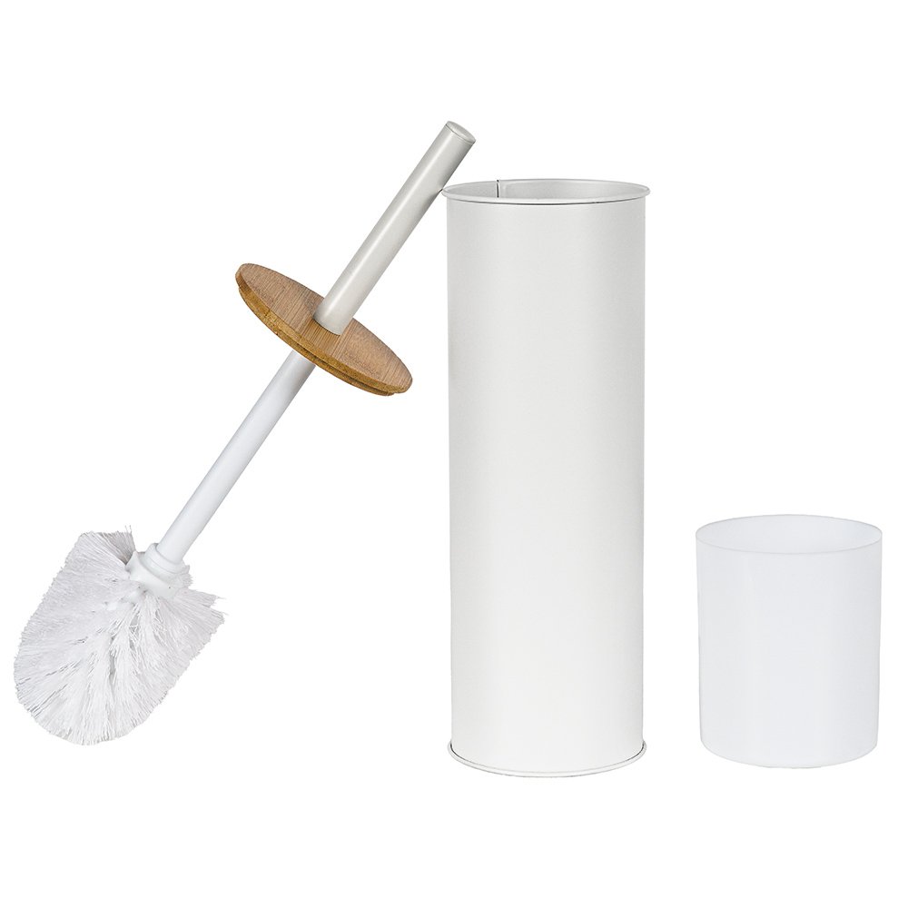 Белый ёршик для унитаза. Изготовлен из стали. С бамбуковым чехлом. Размеры: диаметр — 9,5 см, высота — 38 см. Отделка: матовый белый корпус и ручка. Крышка: бамбуковое дерево.