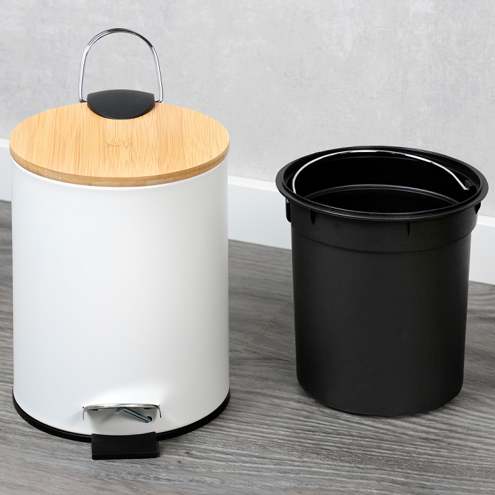 Косметическое ведро KESPER стильное и практичное решение для ванных комнат, гостевых туалетов или спален. Благодаря объему 3 литра и размерам 17 x 17 x 23 см оно идеально впишется даже в небольшие помещения. Металлический корпус с покрытием обеспечивает устойчивость, а крышка из сертифицированного FSC бамбука добавляет декоративный штрих. Благодаря механизму плавного закрывания, ведро закрывается мягко и бесшумно. Съемный пластиковый внутренний контейнер значительно упрощает опорожнение и чистку. Функциональность сочетается с современным дизайном — для ухоженной и стильной ванной комнаты. Компактная косметическая корзинка: объем 3 литра – идеально подходит для ванной комнаты, гостевого туалета или спальни. Механизм плавного закрывания: крышка закрывается мягко и бесшумно – для большего комфорта в повседневной жизни. С бамбуковой крышкой: сертифицированный FSC бамбук в качестве декоративного элемента в современном стиле, имитирующем дерево. Практичный внутренний контейнер: съемная пластиковая вставка облегчает опорожнение и очистку. Прочная конструкция: корпус из металла с покрытием в сочетании с деревянной крышкой – современный, устойчивый и простой в уходе.