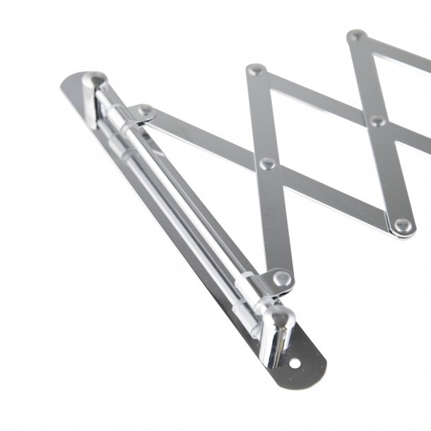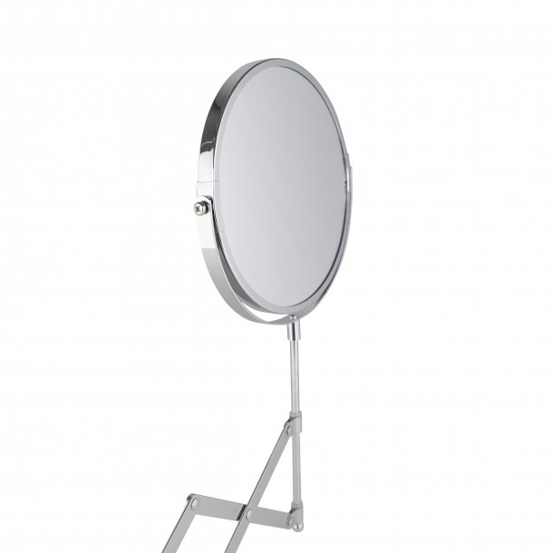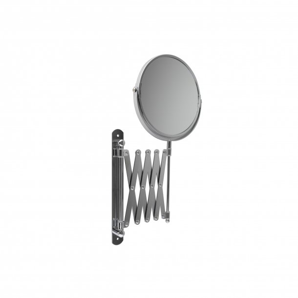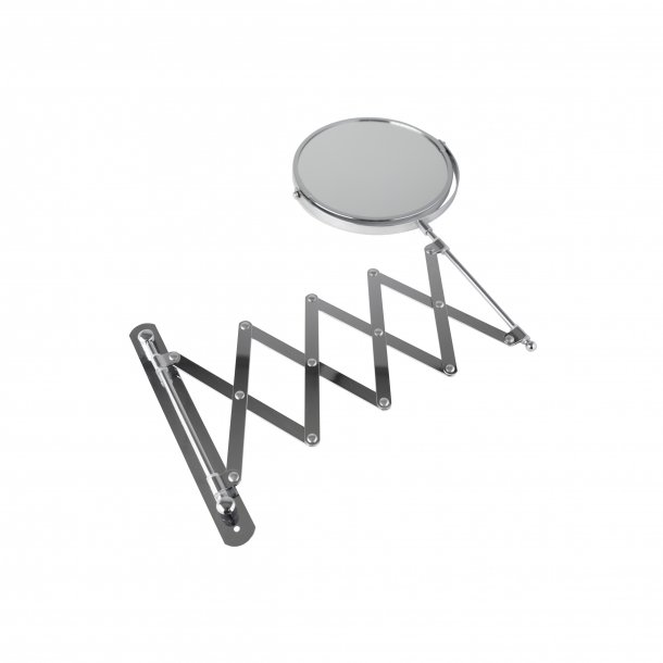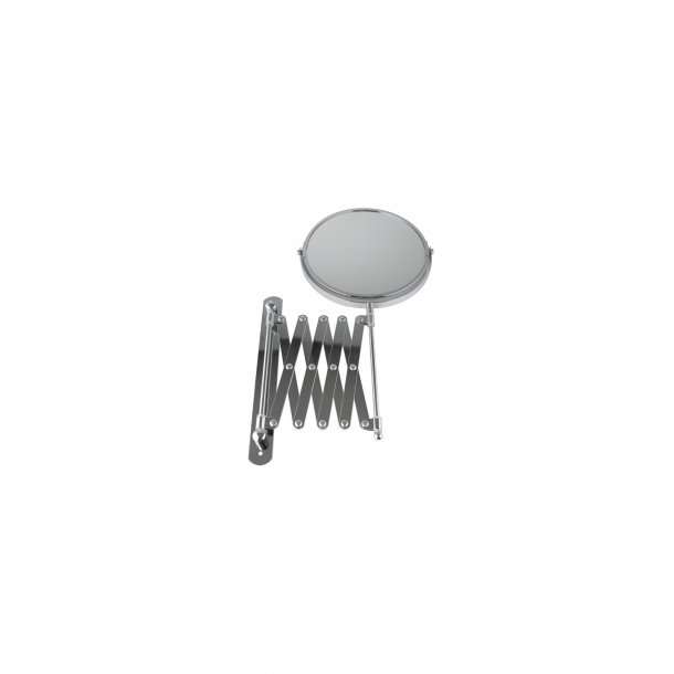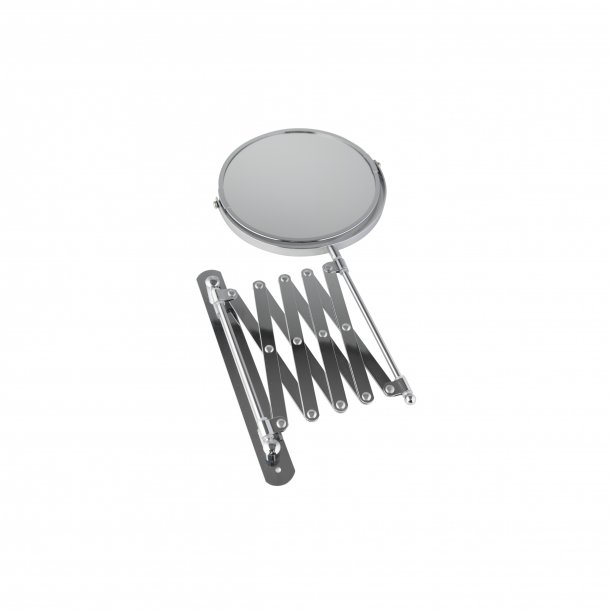 Двустороннее выдвижное зеркало изготовлено из хромированной стали. Выдвигается на 55 см, дизайн крепления выполнен в виде гармошки. Геометрические искажения отсутствуют. Одна сторона имеет увеличение. Крепится на стену с помощью 2 шурупов (входят в комплект). Диаметр зеркала: 17 см. Максимальная длина раскладывания: 55 см.