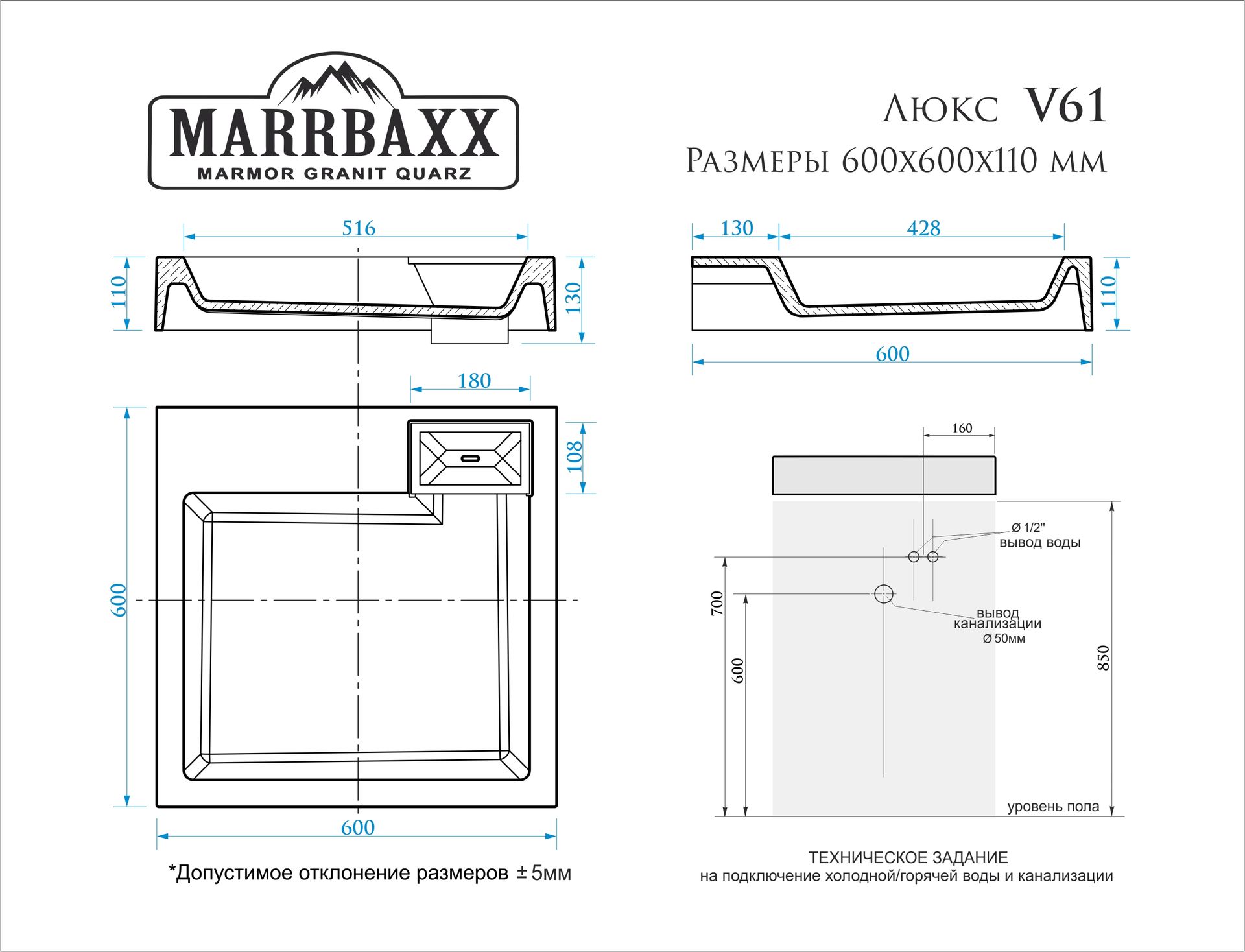 Material: marmură turnată; Chiuveta este instalată pe console deasupra mașinii de spălat (nu este permisă montarea ei pe blatul mașinii de spălat). Kitul include patru piese încorporate în chiuvetă, un șurub și o piuliță, ambalaj - carton ondulat alb cu cinci straturi și folie cu bule și, dacă este necesar, întăritură. Dimensiuni totale: 600 x 600 x 110 mm. Oferim o garanție de 2 ani.