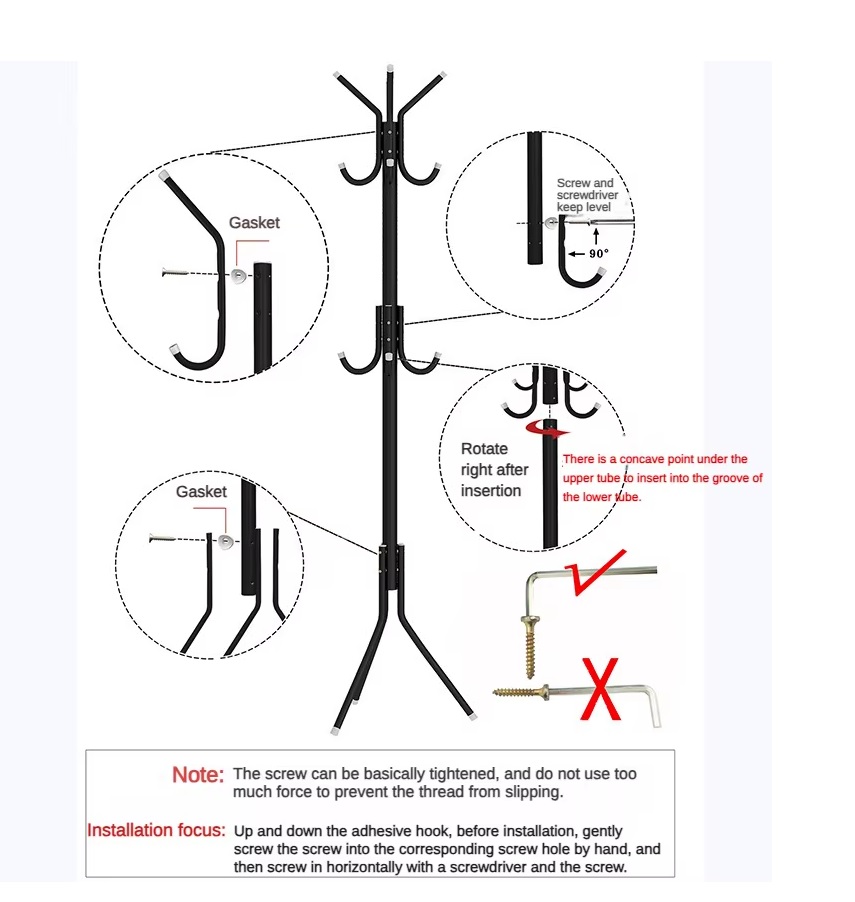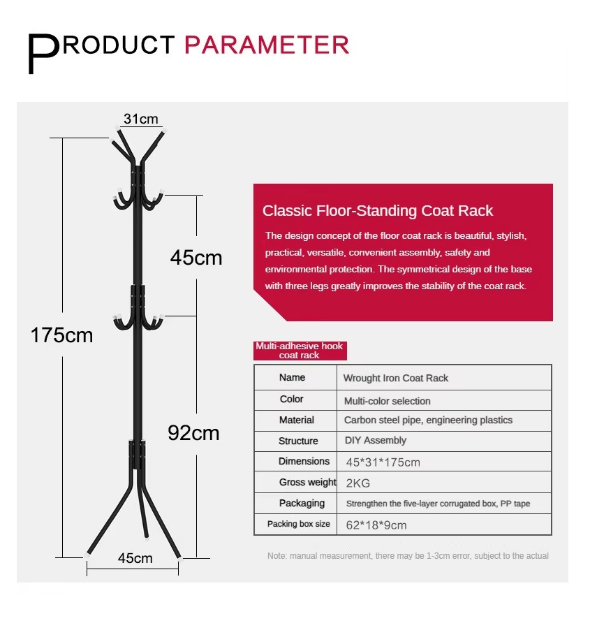 Acest suport de haine și pălării, fabricat din metal, are un design minimalist modern, cu design detașabil și funcționalitate flexibilă. Potrivit pentru camere de zi, dormitoare și dressinguri, acționează ca un organizator multifuncțional pentru paltoane, pălării și genți. Disponibil în mai multe culori, inclusiv negru, alb, auriu, albastru și roșu, se poate integra armonios în diverse interioare. Produsul garantează o toleranță de dimensiune de <±2cm> și o toleranță de greutate de <±10%>, asigurând acuratețe și calitate.