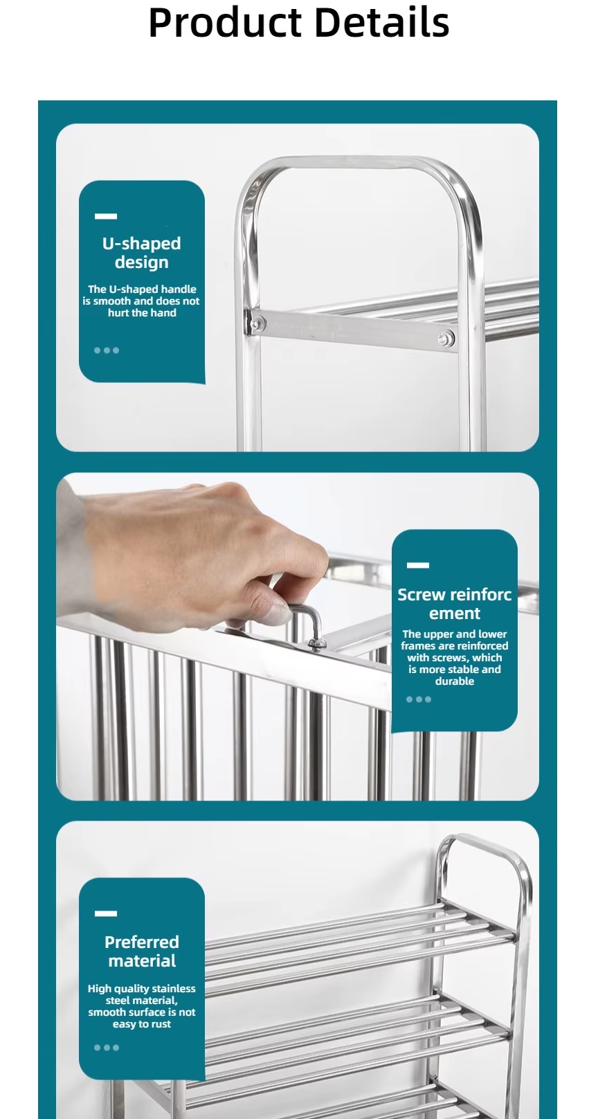 Acest suport pentru pantofi combinat gratuit oferă un design simplu, dar funcțional, perfect pentru depozitarea pe podea în casă. Fabricat din metal durabil, cu opțiuni de culoare personalizabile, oferă stil și caracter practic. Produsul este ușor de asamblat și are o toleranță dimensională de <±2 cm, asigurând dimensiuni precise. Calitatea certificată îndeplinește standardele internaționale, oferind acces pe piață și fiabilitate. Tip metal: oțel inoxidabil.