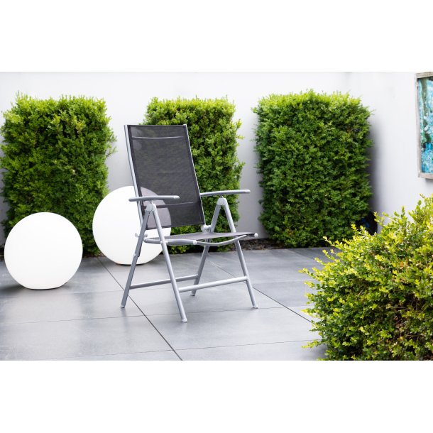 Un scaun pliabil elegant, cu spătar reglabil în 7 poziții, pentru confort maxim atât în interior, cât și în exterior - o combinație atractivă de culori pentru un contrast luminos și modern. Economisește spațiu, ușor de pliat și depozitat - perfect pentru utilizare individuală sau suprapus cu mai multe scaune și o masă pentru a crea un set de sufragerie. Cadrul este fabricat din aluminiu ușor și durabil, argintiu; husa din material textil este neagră. Perfect pentru grădini, terase, balcoane, sere și multe alte spații mari și mici - se potrivește frumos cu alte piese de mobilier de grădină Greemotion. Dimensiuni: aprox. 57 x 106 x 62 cm, dimensiuni pliate: aprox. 57 x 87 x 17 cm, capacitate maximă de încărcare: 110 kg, greutate: aprox. 3,6 kg Relaxează-te cu stil: scaunul pliabil confortabil Chur facilitează acest lucru. Cu un spătar reglabil în 7 poziții, te poți întinde și relaxa complet. Cu o ramă durabilă din aluminiu argintiu și tapițerie din material textil negru, acest scaun elegant completează o gamă largă de interioare și alte piese de mobilier de exterior - perfect pentru o grădină, o seră, un balcon sau o terasă. Pe lângă schema sa modernă de culori, mecanismul de pliere al scaunului permite depozitarea cu economie de spațiu în garaje, subsoluri și spații similare. Aceasta înseamnă că scaunul poate fi depozitat cu grijă iarna, lăsând mult spațiu pentru alte piese de mobilier și multe altele. Deși scaunul pliant este o plăcere de utilizat individual, mai multe scaune pot fi grupate și pentru a crea o atmosferă confortabilă pentru familie și prieteni - un plus încântător pentru orice spațiu, în interior sau în exterior.