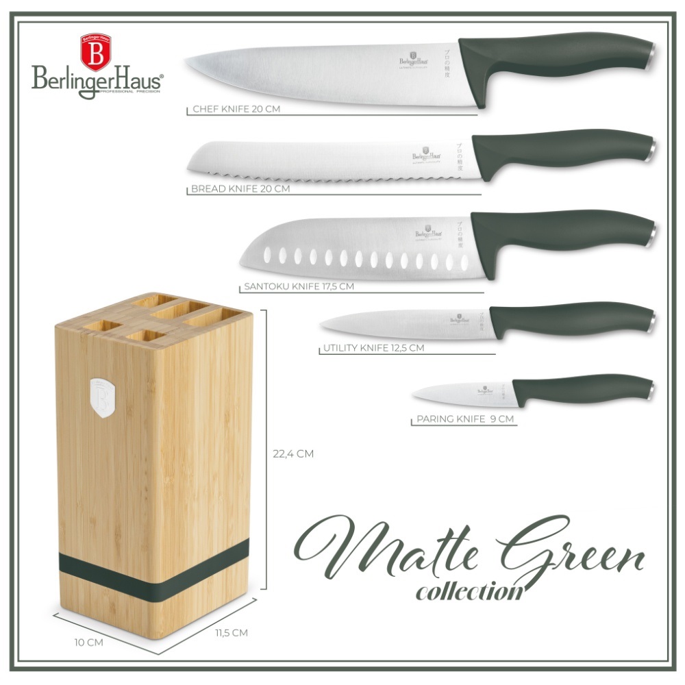 Serie: Verde mat Tip: Set de cuțite Material lamă: oțel inoxidabil 3cr13 Material mâner: plastic cu înveliș Soft Touch Mânere ergonomice concepute pentru confort și siguranță, oferind stabilitate în timpul utilizării. Culoare: Verde mat Setul de bucătărie include: Cuțit de bucătar (20 cm), Cuțit de pâine (20 cm), Cuțit Santoka (17,5 cm), Cuțit utilitar (12,5 cm), Cuțit de curățat (9 cm), Suport din bambus natural...