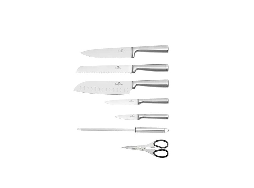 Cuțit de bucătar (20 cm): Un instrument versatil pentru tocat, tăiat cubulețe și tocat cu ușurință. Cuțit de pâine (20 cm): Prezintă o lamă zimțată care feliază pâinea fără a o zdrobi. Cuțit Santoku (17,5 cm): Ideal pentru feliere, tăiere cubulețe și tocat, oferind o senzație de echilibru pentru sarcini de precizie. Cuțit utilitar (12,5 cm): Perfect pentru sarcinile de zi cu zi care necesită precizie. Cuțit de curățat (9 cm): Excelent pentru curățat, feliat și alte lucrări fine.