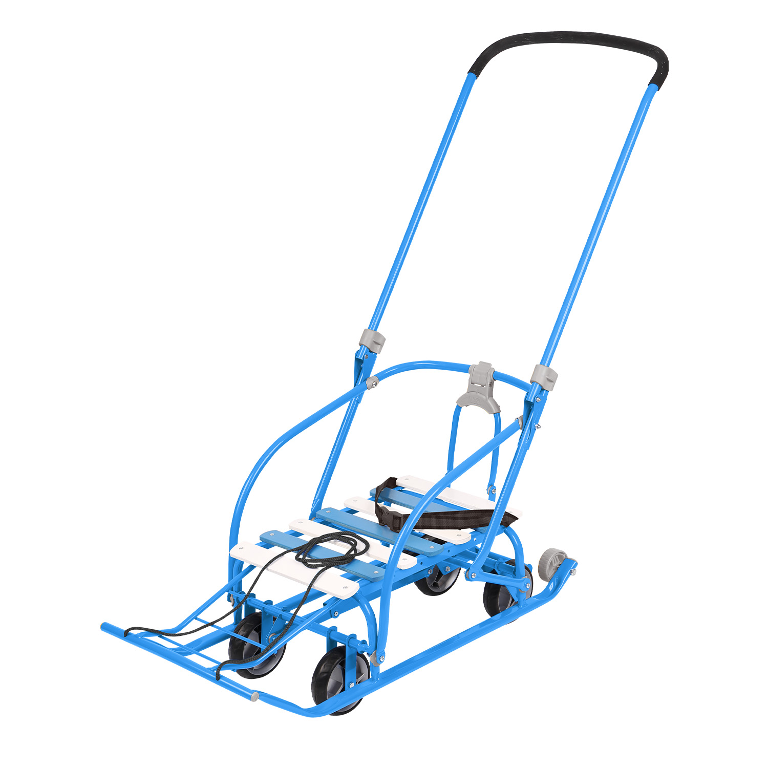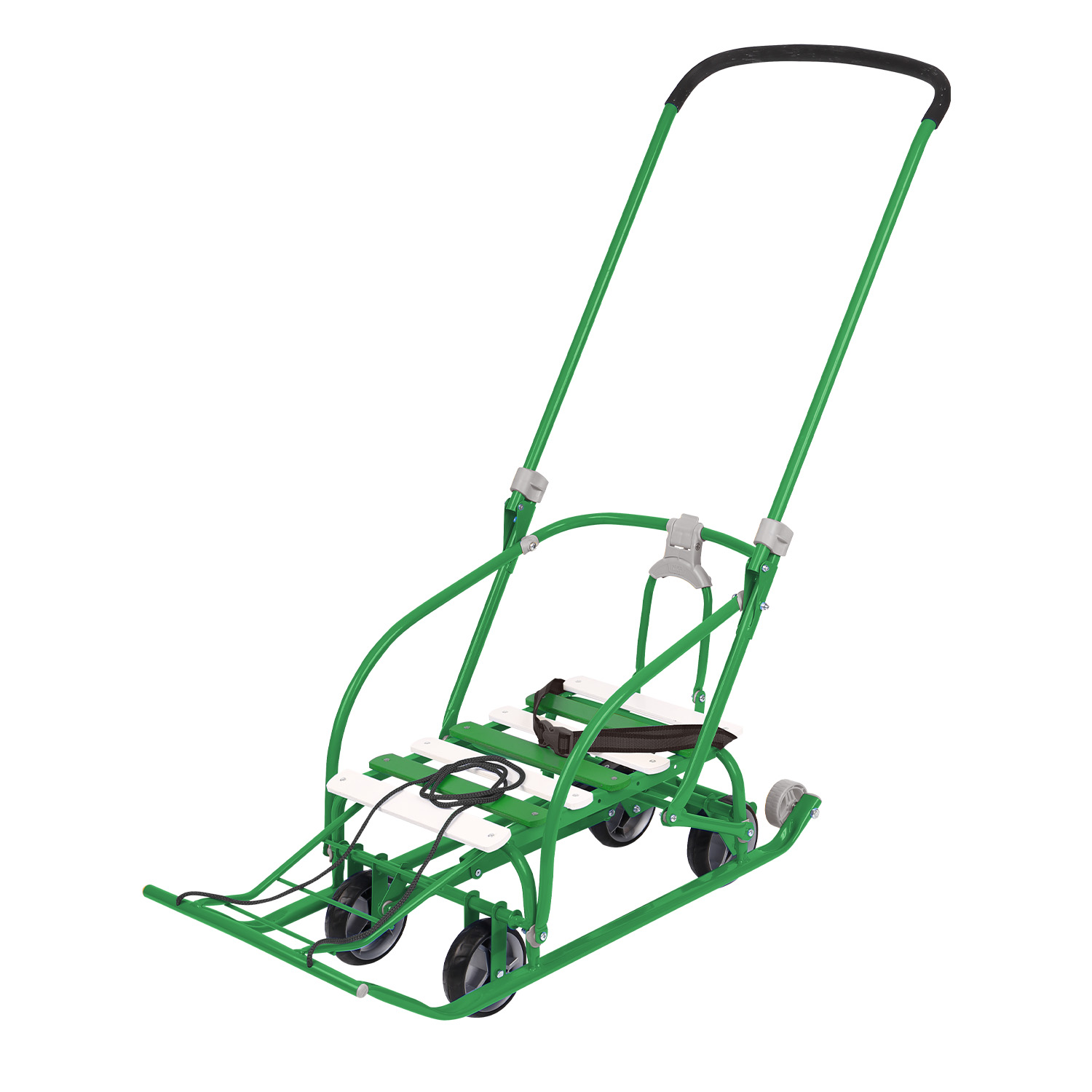 Avantajele săniilor noastre: calitate, siguranță, ergonomie și culori vibrante. — șasiu cu roți retractabile — mâner rabatabil — spătar rabatabil — glisiere plate de 40 mm — bază extinsă — bară transversală — centură de siguranță — roți cauciucate pe glisiere pentru transport ușor