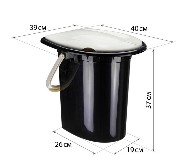 Материал: полипропилен Габариты: 390x370x400мм. Ведро-туалет незаменимая вещь за городом, на даче, а также для людей в возрасте и с ограниченными возможностями. Крышка, исключает распространение неприятных запахов.